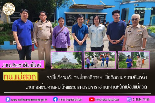 ว่าที่ร้อยตรี ประเสริฐ ปวงละคร นายกเทศมนตรีนครแม่สอด มอบหมายให้ นายกรรณ กัณฑ์นิล พร้อมด้วย นายกรกฤตย์ กรัณยพัฒนพงศ์ เลขานุการนายก สมาชิกสภาเทศบาล และเจ้าหน้าที่ที่เกี่ยวข้อง ลงพื้นที่ร่วมกับกรมโยธาธิการฯ เพื่อติดตามความคืบหน้างานก่อสร้างศาลสมเด็จพระนเรศวรมหาราช และศาลหลักเมืองแม่สอด เพื่อเร่งรัดติดตามความคืบหน้า และเพื่อให้การก่อสร้างดำเนินไปด้วยความ เป็นระเบียบเรียบร้อยบรรลุตามวัตถุประสงค์ของโครงการ