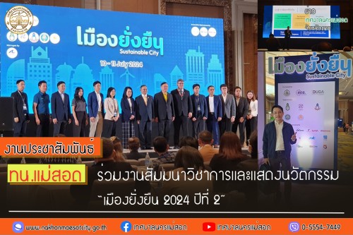 ว่าที่ร้อยตรี ประเสริฐ ปวงละคร นายกเทศมนตรีนครแม่สอด มอบหมายให้ ว่าที่พันตรี ดร.ไพฑูรย์ ปริญญาธรรมกุล ผู้อำนวยการกองยุทธศาสตร์และงบประมาณ เข้าร่วมงานสัมมนาวิชาการและแสดงนวัตกรรม “เมืองยั่งยืน 2024 ปีที่ 2” โดยกระทรวงดิจิทัลเพื่อเศรษฐกิจและสังคม (MDES) และสมาคมผู้ใช้ดิจิทัลไทย (DUGA) เป็นเจ้าภาพร่วมในการจัดงานเมืองยั่งยืน (Sustainable City) 2024 (ปีที่ 2) ภายใต้แนวคิดหลัก “ชุมชนยั่งยืน เมืองยั่งยืนโลกยั่งยืน" ระหว่างวันที่ 10 –11 กรกฎาคม 2567