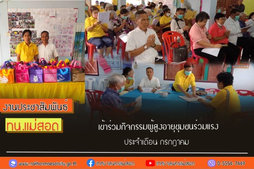 ว่าที่ร้อยตรี ประเสริฐ ปวงละคร นายกเทศมนตรีนครแม่สอด มอบหมายให้ นายสุมิตร กัญจะนะ ผู้อำนวยการกองสวัสดิการสังคม พร้อมด้วย สมาชิกสภาเทศบาล และเจ้าหน้าที่คลินิกชุมชนอบอุ่น กองสาธารณะสุขและสิ่งแวดล้อม เข้าร่วมกิจกรรมผู้สูงอายุชุมชนร่วมแรง ประจำเดือน กรกฎาคม โดยมีกิจกรรม การตรวจสุขภาพ กิจกรรมกายบริหารเบื้องต้นให้แก่ผู้สูงอายุ และร่วมพบปะพูดคุยกับผู้สูงอายุ ให้ผู้สูงอายุในชุมชนได้แลกเปลี่ยนความคิดเห็นร่วมกัน