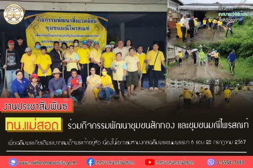 ว่าที่ร้อยตรีประเสริฐ ปวงละคร นายกเทศมนตรีนครแม่สอด มอบหมายให้ นายกรณพงศ์ คงปาน รองนายกเทศมนตรี พร้อมด้วยคณะผู้บริหาร ประธานสภาเทศบาล สมาชิกสภาเทศบาล คณะกรรมการชุมชน และประชาชน เข้าร่วมกิจกรรมพัฒนาชุมชนสักทอง และชุมชนมณีไพรสณฑ์ เพื่อเฉลิมพระเกียรติพระบาทสมเด็จพระเจ้าอยู่หัว เนื่องในโอกาสมหามงคลเฉลิมพระชนมพรรษา 6 รอบ 28 กรกฎาคม 2567 โดยมีกิจกรรมจิตอาสาพัฒนาชุมชน กำจัดวัชพืช และเก็บกวาดขยะ บริเวณโดยรอบชุมชนให้เกิดความสะอาด สวยงาม เป็นระเบียบเรียบร้อย