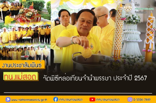ว่าที่ร้อยตรี ประเสริฐ ปวงละคร นายกเทศมนตรีนครแม่สอด เป็นประธานเปิดพิธีหล่อเทียนจำนำพรรษา ประจำปี 2567 พร้อมด้วย คณะผู้บริหาร ประธานสภาเทศบาล สมาชิกสภาเทศบาล หัวหน้าส่วนราชการ ข้าราชการ และพนักงานเทศบาลนครแม่สอด เข้าร่วมพิธีฯ