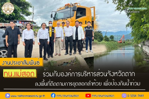 ว่าที่ร้อยตรี ประเสริฐ ปวงละคร นายกเทศมนตรีนครแม่สอด พร้อมด้วย คณะผู้บริหาร สมาชิกสภาเทศบาล และเจ้าหน้าที่ที่เกี่ยวข้อง ร่วมกับองค์การบริหารส่วนจังหวัดตาก ลงพื้นที่ติดตามการขุดลอกลำห้วย เพื่อป้องกันน้ำท่วมขัง ทางองค์การบริหารส่วนจังหวัดตาก โดย นายณัฐวุฒิ ทวีเกื้อกุลกิจ นายกองค์การบริหารส่วนจังหวัดตาก จัดส่งรถแบคโฮและรถบรรทุกขนดินพร้อมเจ้าหน้าที่ในการบูรณาการร่วมกัน บริเวณคลองชลประทาน ถนนแม่สอด - แม่ตาว ชุมชนอิสลาม เขตเทศบาลนครแม่สอด เพื่อป้องกันน้ำท่วมขังอันเนื่องมาจากเศษดิน ต้นไม้ใบหญ้ากีดขวางทางน้ำไหล