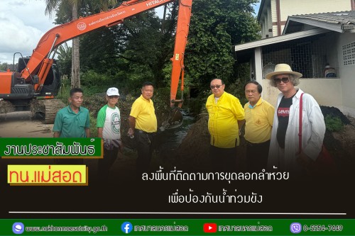 ว่าที่ร้อยตรี ประเสริฐ ปวงละคร นายกเทศมนตรีนครแม่สอด พร้อมด้วย คณะผู้บริหาร ประธานสภาเทศบาล สมาชิกสภาเทศบาล และเจ้าหน้าที่ที่เกี่ยวข้อง ลงพื้นที่ติดตามการขุดลอกลำห้วย เพื่อป้องกันน้ำท่วมขัง ทางองค์การบริหารส่วนจังหวัดตาก โดย นายณัฐวุฒิ ทวีเกื้อกุลกิจ นายกองค์การบริหารส่วนจังหวัดตาก จัดส่งรถแบคโฮและรถบรรทุกขนดินพร้อมเจ้าหน้าที่ในการบูรณาการร่วมกัน บริเวณชุมชนสองแคว2 เขตเทศบาลนครแม่สอด เพื่อป้องกันน้ำท่วมขังอันเนื่องมาจากเศษดิน และสิ่งกีดขวางทางน้ำไหล