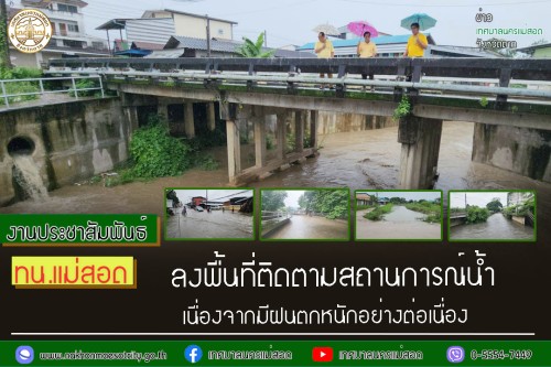 ว่าที่ร้อยตรี ประเสริฐ ปวงละคร นายกเทศมนตรีนครแม่สอด มอบหมายให้ นายกรรณ กัณฑ์นิล รองนายกเทศมนตรี พร้อมด้วย นายกรณพงศ์ คงปาน รองนายกเทศมนตรี และนายประเสริฐ หอวิจิตร เลขานุการนายกเทศมนตรี และเจ้าหน้าที่ที่เกี่ยวข้อง ลงพื้นที่ติดตามสถานการณ์น้ำ เนื่องจากหลังฝนตกหนักอย่างต่อเนื่องในเขตเทศบาลนครแม่สอด