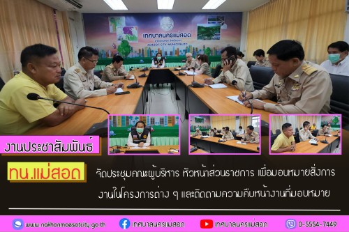 ว่าที่ร้อยตรี ประเสริฐ ปวงละคร นายกเทศมนตรีนคร แม่สอด พร้อมด้วย คณะผู้บริหาร ผู้อำนวยการกอง หัวหน้าส่วนราชการ และเจ้าหน้าที่ที่เกี่ยวข้อง เข้าร่วมการประชุมคณะผู้บริหาร หัวหน้าส่วนราชการ เพื่อมอบหมายสั่งการงานในโครงการต่าง ๆ และติดตามความคืบหน้างานที่มอบหมาย โดยมีหัวข้อการประชุมดังนี้