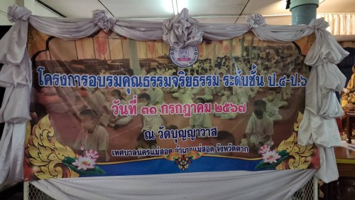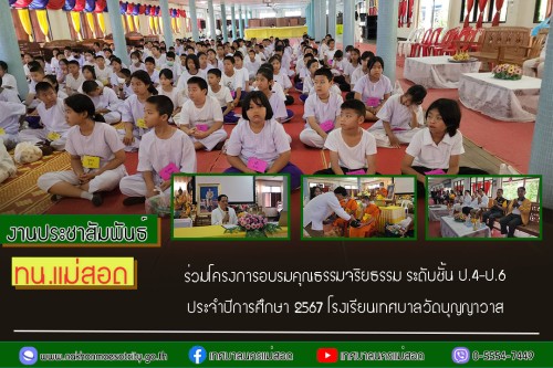 ว่าที่ร้อยตรี ประเสริฐ ปวงละคร นายกเทศมนตรีนครแม่สอด มอบหมายให้ นายกรณพงศ์ คงปาน รองนายกเทศมนตรี สมาชิกสภาเทศบาล และเจ้าหน้าที่ที่เกี่ยวข้อง ร่วมโครงการอบรมคุณธรรมจริยธรรม ระดับชั้น ป.4-ป.6 ประจำปีการศึกษา 2567 โรงเรียนเทศบาลวัดบุญญาวาส ซึ่งมีวัตถุประสงค์ เพื่ออบรมพัฒนาจิตใจและส่งเสริมให้นักเรียนเป็นคนดีมีคุณธรรม จริยธรรม เพื่ออบรมส่งเสริมให้นักเรียนมีระเบียบวินัยและนำหลักธรรมเบื้องต้นไปปฏิบัติในชีวิตประจำวัน และเพื่ออบรมส่งเสริมให้นักเรียนได้ไหว้พระสวดมนต์และนั่งสมาธิ การอบรมเข้าค่ายคุณธรรม จริยธรรม ในครั้งนี้ มีนักเรียนชั้นประถมศึกษาปีที่ 4-6 เข้ารับการอบรม จำนวน 179 คน โดยได้รับความเมตตาจากท่านเจ้าอาวาสวัดบุญญาวาสที่อำนวยความสะดวกด้านสถานที่จัดอบรมและท่านพระครูวิบูลธรรมานุยุตและคณะ เป็นวิทยากรผู้ให้ความรู้ในการอบรมในครั้งนี้