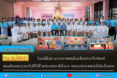 ว่าที่ร้อยตรี ประเสริฐ ปวงละคร นายกเทศมนตรีนครแม่สอด พร้อมด้วย นายประเสริฐ หอวิจิตร และนายกรกฤตย์ กรัณยพัฒนพงศ์ เลขานุการนายกเทศมนตรี เข้าร่วมพิธีกล่าวถวายราชสดุดี เฉลิมพระเกียรติและกล่าวบทอาเศียรวาทถวายพระพรแด่ สมเด็จพระนางเจ้าสิริกิติ์ พระบรมราชินีนาถ พระบรมราชชนนีพันปีหลวง