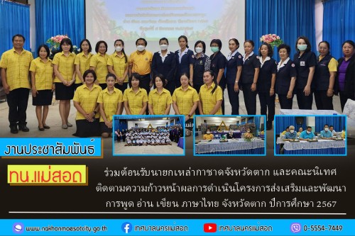 ว่าที่ร้อยตรี ประเสริฐ ปวงละคร นายกเทศมนตรีนครแม่สอด พร้อมด้วย คณะผู้บริหาร ประธานสภาเทศบาลนครแม่สอด และผู้อำนวยการกองการศึกษา ร่วมต้อนรับนายกเหล่ากาชาดจังหวัดตาก และคณะนิเทศ ติดตามความก้าวหน้าผลการดำเนินโครงการส่งเสริมและพัฒนาการพูด อ่าน เขียน ภาษาไทย จังหวัดตาก ปีการศึกษา 2567