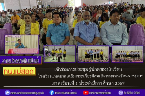 ว่าที่ร้อยตรี ประเสริฐ ปวงละคร นายกเทศมนตรีนครแม่สอด มอบหมายให้ นายกรรณ กัณฑ์นิล รองนายกเทศมนตรีนครแม่สอด เป็นประธานการประชุมฯผู้ปกครองนักเรียนโรงเรียนเทศบาลเฉลิมพระเกียรติสมเด็จพระเทพรัตนราชสุดาฯ ภาคเรียนที่ 1 ประจำปีการศึกษา 2567 พร้อมด้วย คณะผู้บริหาร สมาชิกสภาเทศบาล หัวหน้าส่วนราชการ คณะครู คณะกรรมการสถานศึกษาขั้นพื้นฐาน และผู้ปกครองนักเรียน เข้าร่วมการประชุมในครั้งนี้ โดยมีนางสาวนิภาภรณ์ อินนาคกูล ผู้อำนวยการสถานศึกษา กล่าววัตถุประสงค์ การจัดประชุมในครั้งนี้ เป็นกระบวนการแลกเปลี่ยนความคิดและพบปะพูดคุยกับผู้ปกครอง โดยจะมีครูประจำชั้นหรือครูที่ปรึกษาดำเนินกิจกรรม และเอื้ออำนวยให้ผู้ปกครองได้พบปะพูดคุยแลกเปลี่ยนความคิด มีการสร้างสัมพันธภาพที่ดี อีกทั้งแจ้งแนวทางการดำเนินงาน ของโรงเรียนความก้าวหน้าทางการจัดการศึกษามีการเปิดโอกาสให้ผู้ปกครองได้มีส่วนร่วม ในการให้ข้อเสนอแนะสิ่งที่จะเป็นประโยชน์ต่อโรงเรียนในการพัฒนาคุณภาพการศึกษา