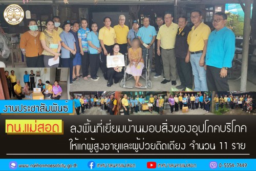 ว่าที่ร้อยตรี ประเสริฐ ปวงละคร นายกเทศมนตรีนครแม่สอด พร้อมด้วย คณะผู้บริหาร สมาชิกสภาแทศบาล เจ้าหน้าที่คลินิกชุมชนอบอุ่น กองสาธารณสุขและสิ่งแวดล้อม กลุ่มอสม. และเจ้าหน้าที่ที่เกี่ยวข้อง ลงพื้นที่เยี่ยมบ้านมอบรถเข็น พร้อมมอบสิ่งของอุปโภคบริโภคให้แก่ผู้สูงอายุและผู้ป่วยติดเตียงในชุมชนปู่แดง ชุมชนดอนไชย และชุมชนสันต้นปิน จำนวน 11 ราย โดยได้รับการสนับสนุนจากกองทุนหลักประกันสุขภาพท้องถิ่นเทศบาลนครแม่สอด