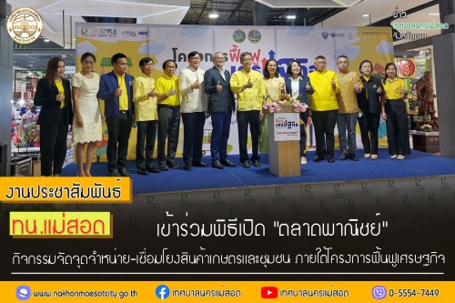 ว่าที่ร้อยตรี ประเสริฐ ปวงละครนายกเทศมนตรีนครแม่สอด พร้อมด้วย คณะผู้บริหารเทศบาลนครแม่สอด เข้าร่วมพิธีเปิด "ตลาดพาณิชย์" กิจกรรมจัดจุดจำหน่าย-เชื่อมโยงสินค้าเกษตรและชุมชน ภายใต้โครงการฟื้นฟูเศรษฐกิจ โดยมีนายสุรพล วงศ์สุขพิศาล รองผู้ว่าราชการจังหวัดตาก เป็นประธานในพิธีเปิดตลาดพาณิชย์ฯ และมีส่วนราชการ ภาคเอกชน ผู้ประกอบการ และประชาชน เข้าร่วมงานฯ