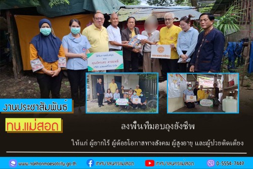 ว่าที่ร้อยตรี ประเสริฐ ปวงละคร นายกเทศมนตรีนครแม่สอด พร้อมด้วย คณะผู้บริหาร สมาชิกสภาเทศบาล และเจ้าหน้าที่คลินิกชุมชนอบอุ่น กองสาธารณสุขและสิ่งแวดล้อม ลงพื้นที่มอบถุงยังชีพ พร้อมเงินบรรเทาความเดือดร้อน ให้แก่ ผู้ยากไร้ ผู้ด้อยโอกาสทางสังคม ผู้สูงอายุ และผู้ป่วยติดเตียง ที่ ชุมชนร่วมแรง ชุมชนบ้านเหนือสามัคคี และชุมชนสักทอง โดยได้รับการสนับสนุนจากกองทุนหลักประกันสุขภาพเทศบาลนครแม่สอดร่วมกับนายอัครเดช ตาสะหลี ประธานผู้บริหารแม่สอดฟรีโซน
