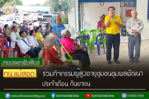 ว่าที่ร้อยตรี ประเสริฐ ปวงละคร นายกเทศมนตรีนครแม่สอด มอบหมายให้ นายกรรณ กัณฑ์นิล รองนายกเทศมนตรี พร้อมด้วย คณะผู้บริหาร สมาชิกสภาเทศบาล เข้าร่วมการจัดกิจกรรมผู้สูงอายุชุมชนชุมพลพัฒนาประชาสัมพันธ์ข้อมูลข่าวสาร และพบปะพูดคุย รับฟัง แลกเปลี่ยนความเห็นกับผู้สูงอายุในชุมชน