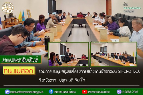 ว่าที่ร้อยตรี ประเสริฐ ปวงละคร นายกเทศมนตรีนครแม่สอด มอบหมายให้ ว่าที่พันตรี ดร.ไพฑูรย์ ปริญญาธรรมกุล ผู้อำนวยการ กองยุทธศาสตร์และงบประมาณ ในฐานะโค้ชชมรม STRONG - จิตพอเพียงต้านทุจริต จังหวัดตาก และนายจิรวัฒน์ บุตรศรีพงศ์ นักวิเคราะห์นโยบายและแผนชำนาญการ ในฐานะสมาชิกชมรม STRONG – จิตพอเพียง ต้านทุจริต จังหวัดตาก เข้าร่วมการประชุมคณะทำงาน คณะกรรมการบริหารชมรมฯ เพื่อสรุปผลและจัดทำรายงานผลการดำเนินโครงการสร้างแกนนำเยาวชน STRONG IDOL จังหวัดตาก ปลูกคนดี เริ่มที่ใจโดย ชมรม STRONG - จิตพอเพียงต้านทุจริตจังหวัดตาก