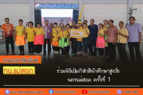 ว่าที่ร้อยตรี ประเสริฐ ปวงละคร นายกเทศมนตรีนครแม่สอด พร้อมด้วย คณะผู้บริหาร สมาชิกสภาเทศบาล ผู้อำนวยการกองสวัสดิการสังคม และเจ้าหน้าที่ที่เกี่ยวข้อง ร่วมพิธีเปิดกีฬาสีนักศึกษาสูงวัยนครแม่สอด ครั้งที่ 1 เพื่อส่งเสริมการออกกำลังกาย สร้างความสนุกสนานหวังให้ผู้สูงอายุแข็งแรง ทั้งร่างกายและจิตใจ