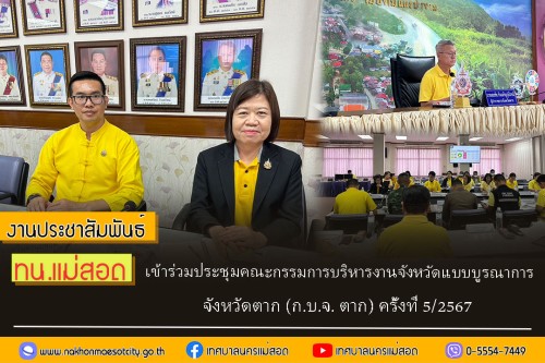ว่าที่ร้อยตรี ประเสริฐ ปวงละคร นายกเทศมนตรีนครแม่สอด มอบหมายให้ นายจิรวัฒน์ บุตรศรีพงศ์ ตำแหน่ง นักวิเคราะห์นโยบายและแผนชำนาญการ กองยุทธศาสตร์และงบประมาณ เข้าร่วมประชุมคณะกรรมการบริหารงานจังหวัดแบบบูรณาการ จังหวัดตาก (ก.บ.จ. ตาก) ครั้งที่ 5/2567 เพื่อพิจารณาเปลี่ยนแปลงรายละเอียดโครงการตามแผนปฏิบัติราชการประจำปีของจังหวัดตาก ประจำปีงบประมาณ พ.ศ. 2568