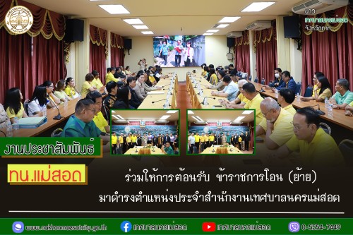 ว่าที่ร้อยตรี ประเสริฐ ปวงละคร นายกเทศมนตรีนครแม่สอด พร้อมด้วย คณะผู้บริหาร สมาชิกสภาเทศบาล หัวหน้าส่วนราชการ พนักงานเทศบาล ร่วมให้การต้อนรับ ข้าราชการโอน (ย้าย) มาดำรงตำแหน่งประจำสำนักงานเทศบาลนครแม่สอด 5 ท่าน