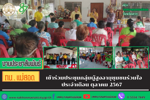 ว่าที่ร้อยตรี ประเสริฐ ปวงละคร นายกเทศมนตรีนครแม่สอด พร้อมด้วย คณะผู้บริหาร สมาชิกสภาเทศบาล เจ้าหน้าที่โรงพยาบาลแม่สอด และเจ้าหน้าที่ที่เกี่ยวข้อง เข้าร่วมการประชุมกลุ่มผู้สูงอายุชุมชนร่วมใจ ประจำเดือน ตุลาคม 2567 โดยมีกิจกรรมการตรวจสุขภาพ และร่วมพบปะพูดคุย เพื่อเปิดโอกาสให้ผู้สูงอายุในชุมชนได้แลกเปลี่ยนความคิดเห็นและทำกิจกรรมร่วมกัน