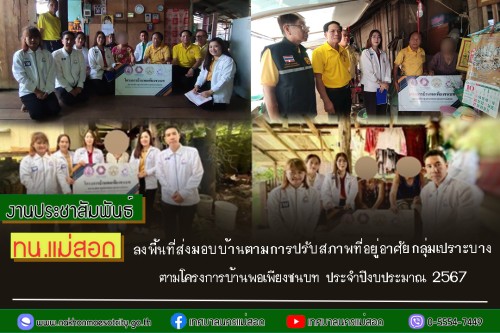 ว่าที่ร้อยตรี ประเสริฐ ปวงละคร นายกเทศมนตรีนครแม่สอด พร้อมด้วย คณะผู้บริหาร สมาชิกสภาเทศบาล และเจ้าหน้าที่กองสวัสดิการสังคม ลงพื้นที่ส่งมอบบ้านตามการปรับสภาพที่อยู่อาศัยกลุ่มเปราะบาง 4 ชุมชน ได้แก่ ชุมชนร่วมใจ ชุมชนประชารักษ์ ชุมชนสักทอง และชุมชนมณีไพรสณฑ์ ตามโครงการบ้านพอเพียงชนบท ประจำปีงบประมาณ 2567