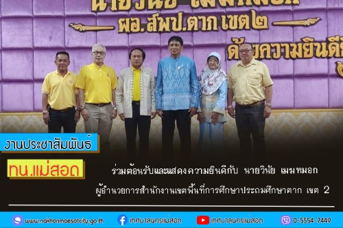 ว่าที่ร้อยตรี ประเสริฐ ปวงละคร นายกเทศมนตรีนครแม่สอด พร้อมด้วย คณะผู้บริหาร สมาชิกสภาเทศบาล และเจ้าหน้าที่ที่เกี่ยวข้อง ร่วมต้อนรับและแสดงความยินดีกับ นายวินัย เมฆหมอก ผู้อำนวยการสำนักงานเขตพื้นที่การศึกษาประถมศึกษาตาก เขต 2