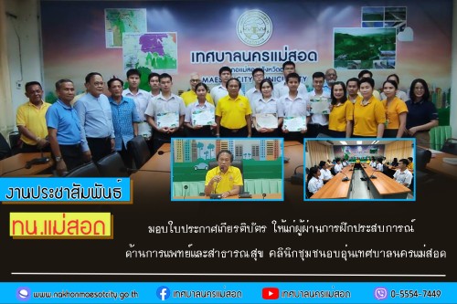 ว่าที่ร้อยตรี ประเสริฐ ปวงละคร นายกเทศมนตรีนครแม่สอด พร้อมด้วย คณะผู้บริหาร สมาชิกสภาเทศบาล เจ้าหน้าที่คลินิกชุมชนอบอุ่นเทศบาลนครแม่สอด และคณะครู เข้าร่วมพิธีมอบใบประกาศเกียรติบัตร ผู้ผ่านการฝึกประสบการณ์ด้านการแพทย์และสาธารณสุข คลินิกชุมชนอบอุ่นเทศบาลนครแม่สอด แก่นักเรียนระดับชั้นมัธยมศึกษาปีที่ 5 ห้องเรียนวิทยาศาสตร์ คณิตศาสตร์เข้มข้น โรงเรียนสรรพวิทยาคม จำนวน 10 ราย เพื่อส่งเสริมทักษะชีวิต และทักษะการทำงานร่วมกับผู้อื่น รวมถึงการสร้างเจตคติที่ดีต่อกลุ่มงานวิทยาศาสตร์ – สุขภาพ ระหว่างวันที่ 30 กันยายน 2567 ถึงวันที่ 11 ตุลาคม 2567 ณ คลินิกชุมชนอบอุ่น เทศบาลนครแม่สอด อำเภอแม่สอด จังหวัดตาก