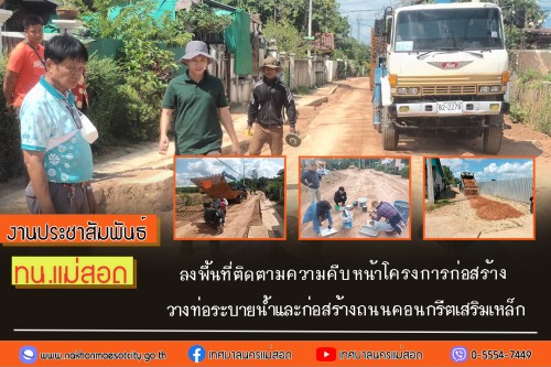 ว่าที่ร้อยตรี ประเสริฐ ปวงละคร นายกเทศมนตรีนครแม่สอด มอบหมายให้ ว่าที่ร้อยตรี สมชาย จาจุ๋ย ที่ปรึกษานายกเทศมนตรี พร้อมด้วย สมาชิกสภาเทศบาล เจ้าหน้าที่กองช่างสุขาภิบาล และเจ้าหน้าที่ที่เกี่ยวข้อง ลงพื้นที่ติดตามความคืบหน้าโครงการก่อสร้างวางท่อระบายน้ำและการก่อสร้าง ถนนคอนกรีตเสริมเหล็ก ชุมชนร่วมแรง และลงพื้นที่ติดตามความคืบหน้าการขุดร่องระบายน้ำแก้ไขปัญหาน้ำท่วมขัง ชุมชนสองแคว 2