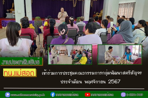 ว่าที่ร้อยตรี ประเสริฐ ปวงละคร นายกเทศมนตรีนครแม่สอด มอบหมายให้ นายไกรสร กิจการ พร้อมด้วย นายกรณพงศ์ คงปาน รองนายกเทศมนตรีนครแม่สอด ผู้อำนวยการกองสวัสดิการสังคม คณะกรรมการกลุ่มพัฒนาสตรีทั้ง 20 ชุมชน และเจ้าหน้าที่ที่เกี่ยวข้อง เข้าร่วมการประชุมคณะกรรมการกลุ่มพัฒนาสตรีสัญจร ประจำเดือน พฤศจิกายน 2567