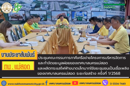 เทศบาลนครแม่สอด จัดประชุมคณะกรรมการภาคีเครือข่ายโครงการบริหารจัดการ และกำจัดขยะมูลฝอยของเทศบาลนครแม่สอด และผลิตกระแสไฟฟ้าขนาดเล็กมากใช้ขยะชุมชนเป็นเชื้อเพลิงของเทศบาลนครแม่สอด ระยะก่อสร้าง ครั้งที่ 1/2568