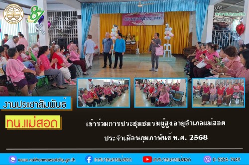 ว่าที่ร้อยตรี ประเสริฐ ปวงละคร นายกเทศมนตรีนครแม่สอด พร้อมด้วย นายกรณพงศ์ คงปาน รองนายกเทศมนตรีนครแม่สอด คณะผู้บริหาร สมาชิกสภาเทศบาล ประธานและคณะกรรมการชมรมผู้สูงอายุอำเภอแม่สอด เข้าร่วมการประชุมชมรมผู้สูงอายุอำเภอแม่สอด ประจำเดือนกุมภาพันธ์ พ.ศ. 2568 และร่วมกิจกรรมนันทนาการส่งเสริมสุขภาพผู้สูงอายุ