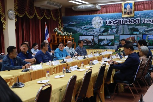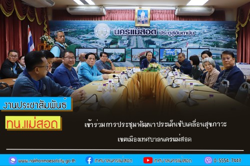 ว่าที่ร้อยตรี ประเสริฐ ปวงละคร นายกเทศมนตรีนครแม่สอด พร้อมด้วย คณะผู้บริหาร สมาชิกสภาเทศบาล รองปลัดเทศบาลนครแม่สอด ผู้อำนวยการกอง หัวหน้าส่วนราชการ และเจ้าหน้าที่ที่เกี่ยวข้อง เข้าร่วมการประชุมพัฒนาประเด็นขับเคลื่อนสุขภาวะเขตเมืองเทศบาลนครแม่สอด