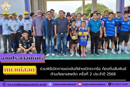 ว่าที่ร้อยตรี ประเสริฐ ปวงละคร นายกเทศมนตรีนครแม่สอด พร้อมด้วย คณะผู้บริหาร รองปลัดเทศบาลนครแม่สอด เจ้าหน้าที่ฝ่ายป้องกันและบรรเทาสาธารณภัยเทศบาลนครแม่สอด และเจ้าหน้าที่ที่เกี่ยวข้อง ร่วมพิธีเปิดการแข่งขันกีฬาเซปักตะกร้อท้องถิ่นสัมพันธ์ ต้านภัยยาเสพติด ครั้งที่ 2 ประจำปี 2568 โดยมีวัตถุประสงค์ เพื่อจัดการแข่งขันกีฬาเซปักตะกร้อภายในอำเภอแม่สอดเพื่อให้เยาวชนและประชาชนมีสุขภาพสมบูรณ์ แข็งแรง ทั้งร่างกาย และจิตใจ เพื่อให้เยาวชนรู้จักใช้เวลาว่างให้เกิดประโยชน์ไม่ยุ่งเกี่ยวกับยาเสพติด และเพื่อเป็นการประชาสัมพันธ์การใช้ชีวิตวิถีใหม่ในสังคมแห่งการเปลี่ยนแปลง