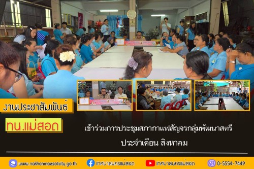 โดย นายกุล เครือวีระ นายกเทศมนตรีนครแม่สอด มอบหมายให้ นายจิระวัฒน์ มงคลจุฑาเศรษฐ รองนายกเทศมนตรีนครแม่สอด พร้อมด้วย นายสมเดช คำสุข ประธานสภาเทศบาลนครแม่สอด สมาชิกสภาเทศบาล ผู้อำนวยการและเจ้าหน้าที่กองสวัสดิการสังคม และกลุ่มพัฒนาสตรี เข้าร่วมการประชุมสภากาแฟสัญจรกลุ่มพัฒนาสตรี ประจำเดือน สิงหาคม