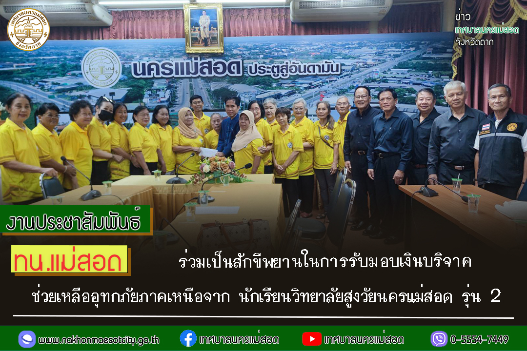 ทน.แม่สอด ร่วมเป็นสักขีพยานในการรับมอบเงินบริจาคช่วยเหลืออุทกภัยภาคเหนือจากนักเรียนวิทยาลัยสูงวัยนครแม่สอด รุ่น 2