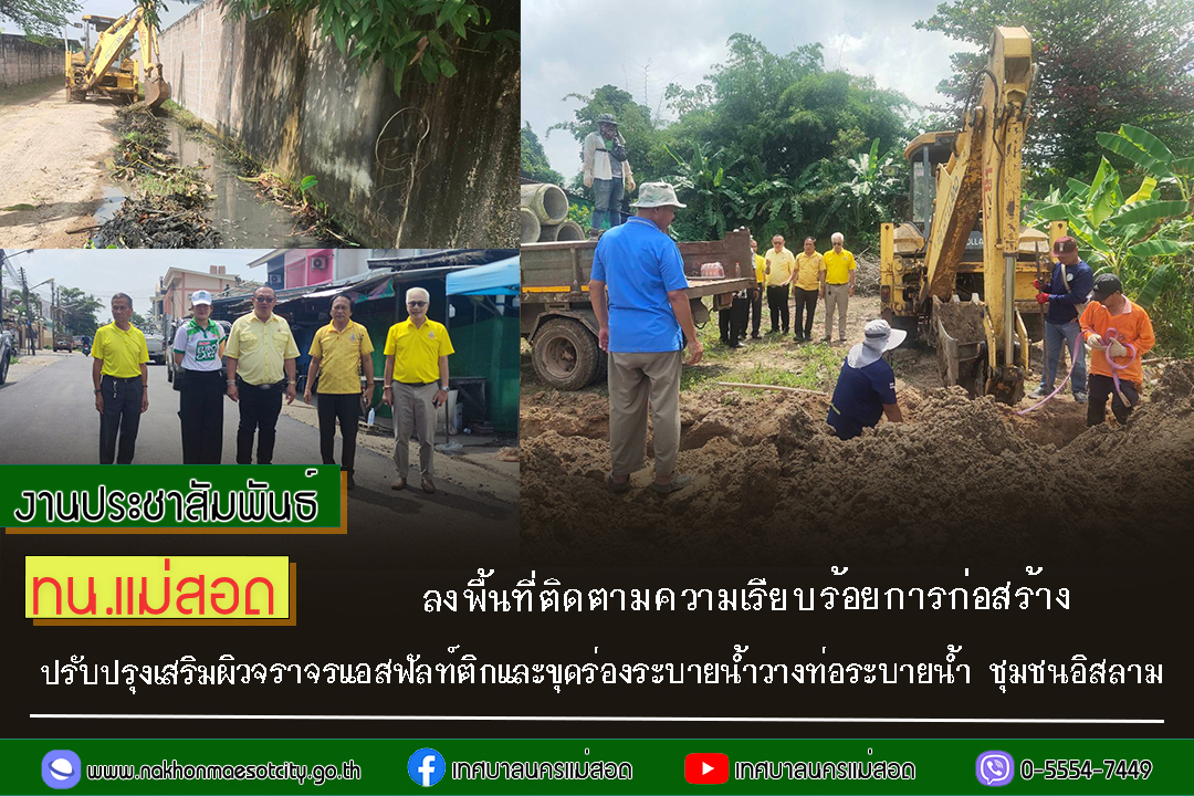 ทน.แม่สอด ลงพื้นที่ติดตามความเรียบร้อยการก่อสร้างปรับปรุงเสริมผิวจราจรแอสฟัลท์ติก และขุดร่องระบายน้ำ วางท่อระบายน้ำ ชุมชนอิสลาม