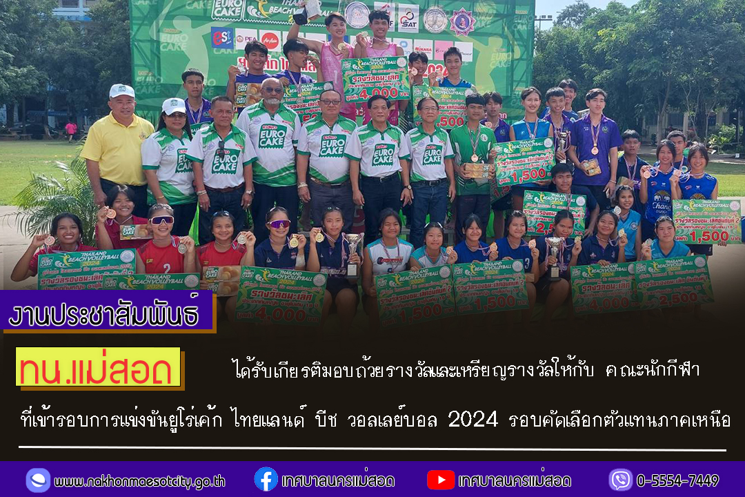 ทน.แม่สอด ได้รับเกียรติมอบถ้วยรางวัลและเหรียญรางวัลให้กับ คณะนักกีฬาที่เข้ารอบการแข่งขันยูโร่เค้ก ไทยแลนด์ บีช วอลเลย์บอล 2024 รอบคัดเลือกตัวแทนภาคเหนือ