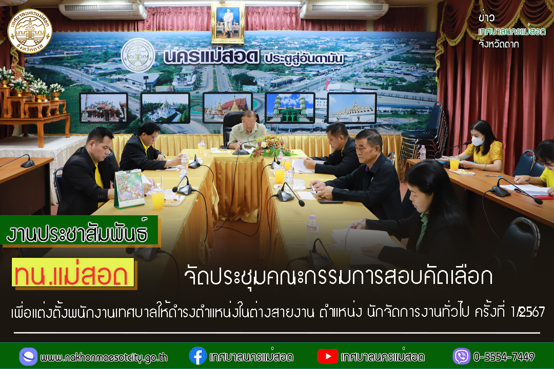 เทศบาลนครแม่สอด จัดประชุมคณะกรรมการสอบคัดเลือก เพื่อแต่งตั้งพนักงานเทศบาลให้ดำรงตำแหน่งในต่างสายงาน ตำแหน่ง นักจัดการงานทั่วไป ครั้งที่ 1/2567