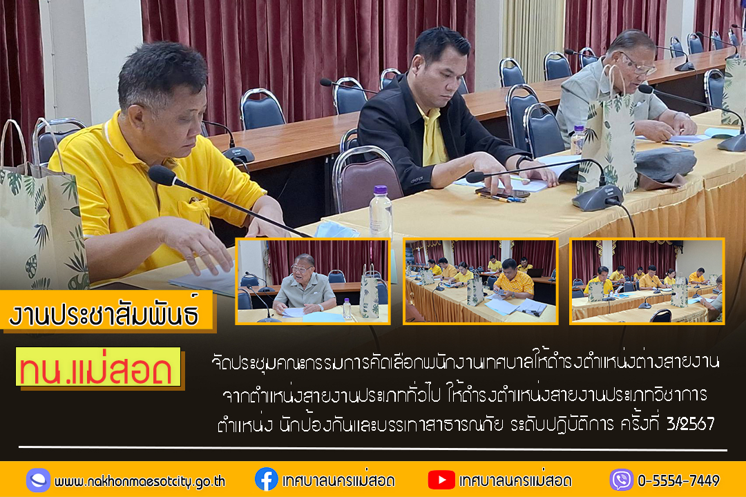 ทน.แม่สอด จัดประชุมคณะกรรมการคัดเลือกพนักงานเทศบาลให้ดำรงตำแหน่ง ต่างสายงานจากตำแหน่งสายงานประเภททั่วไปให้ดำรงตำแหน่งสายงานประเภทวิชาการ ตำแหน่ง นักป้องกันและบรรเทาสาธารณภัย ระดับปฏิบัติการ ครั้งที่ 3/2567