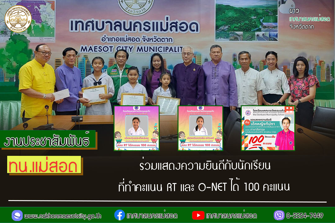 เทศบาลนครแม่สอด ร่วมแสดงความยินดีกับนักเรียนที่ทำคะแนน RT และ O-NET ได้ 100 คะแนน